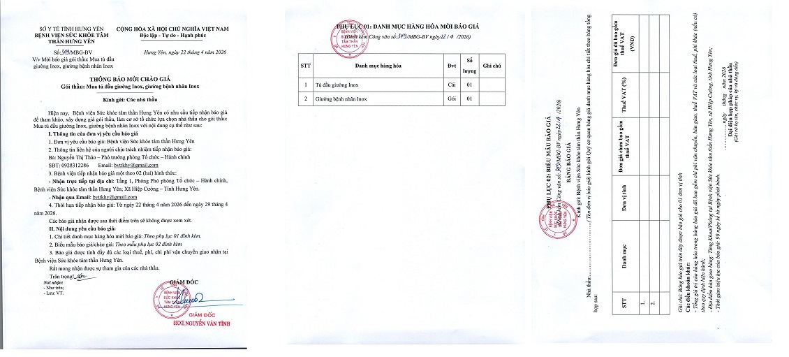 | Về việc / trích yếu | Mời báo giá: Mua tủ đầu giường Inox, giường bệnh nhân Inox |